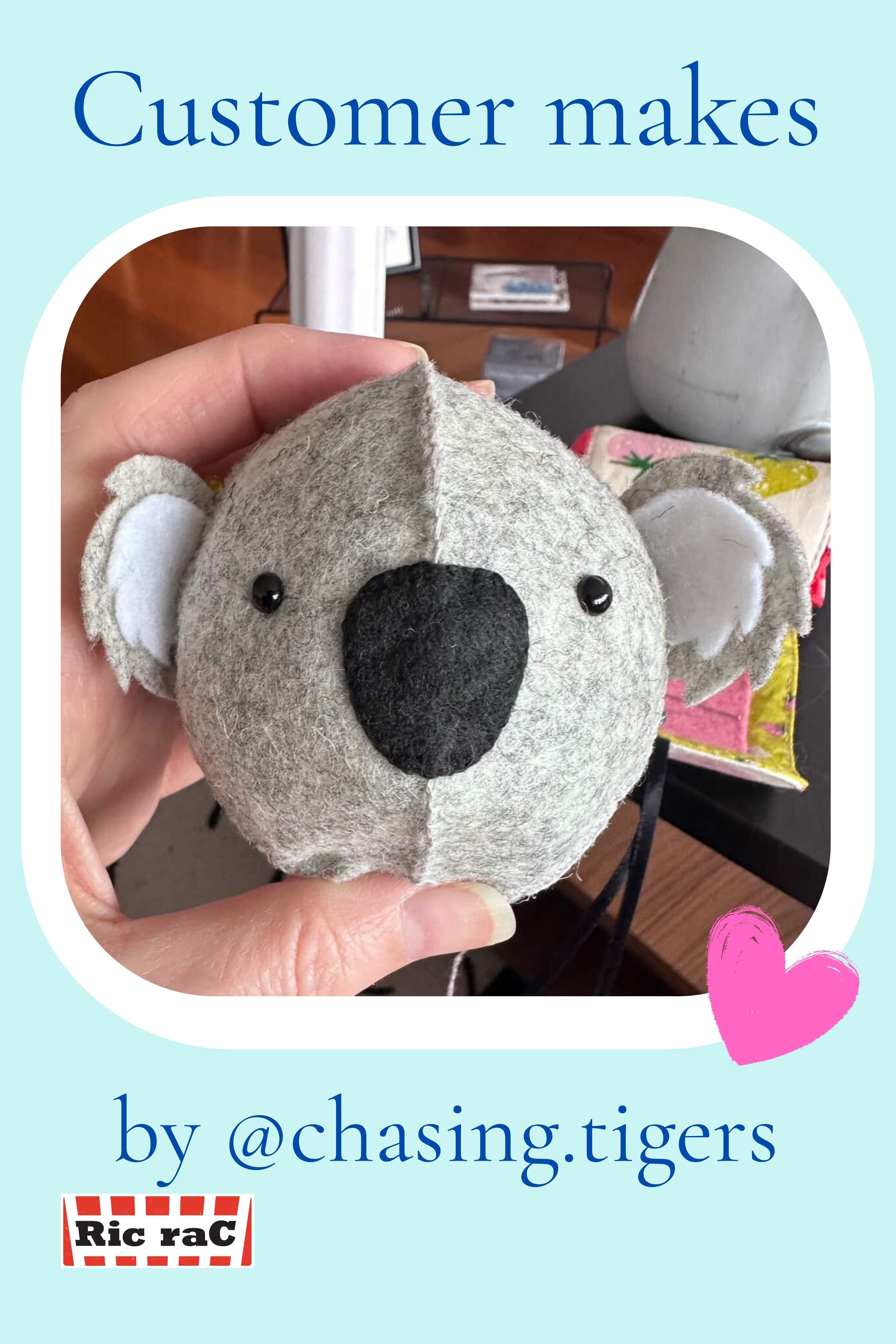 This precious mother and baby koala sewing pattern is completely hand sewn. No need for a sewing machine ! It is a great portable project to work on anytime and anywhere. It is suitable for all skill levels, and is a great introduction to toy making.