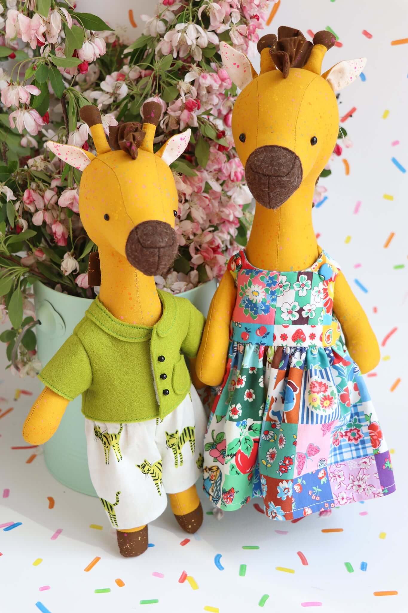 Meet Noodle & Peach — two playful giraffe soft toys you can sew at home! This PDF sewing pattern includes step-by-step instructions to create a large and small giraffe, complete with reversible dress, felt cardigan, and shorts.
